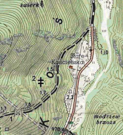 2. Stare Kościeliska. Zwraca uwagę „kapliczka zbójnicka”, która faktycznie była kapliczką górników, o czym świadczą skrzyżowane młoty – symbol stanu górniczego. Na polanie istniało osiedle górnicze, prawdopodobnie już od XV w, kiedy w masywie Ornaku powstały pierwsze kopalnie srebra i miedzi. W 1770 r. powstała tu huta metali kolorowych nakładem rodziny Prokopowiczów, z czasem wybudowano tu domy dla górników, karczmę i wspomnianą kapliczkę. Na pocz. XIX wieku, wraz z przekwalifikowaniem się górnictwa tatrzańskiego na wydobycie rudy żelaza, również hutę przerobiono na hutę żelaza. W 1817 r. przeniesiono ją do nowego ośrodka hutniczego w Kuźnicach.